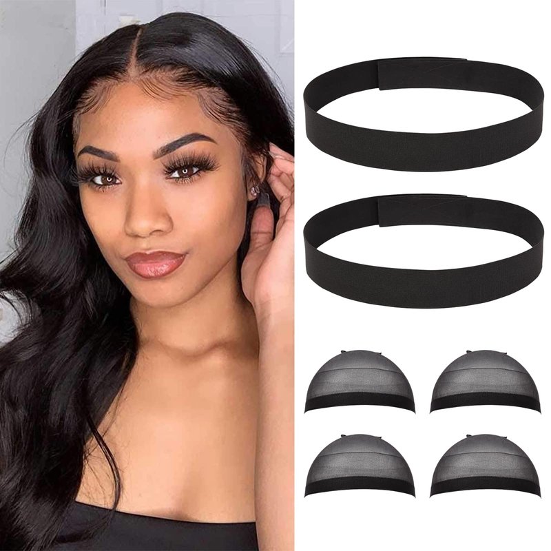 Elastic Bands for Wig 2pcs 3.5cm Edges Bands Lace Melting Band Wig Band for Edges with 4PCS Wig Caps, 60cm Flexible Grip Headband Laying Band Adjustable Ends for Baby Hair Closure
