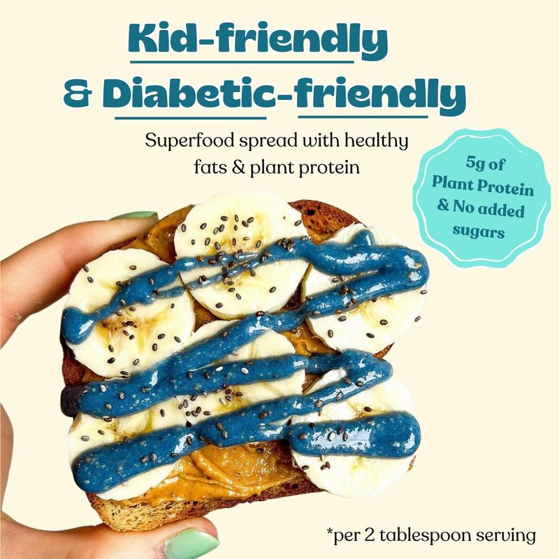 - YEP, IT’S BLUE - No, you’re not losing it and no it’s not fake. We added blue spirulina to our creamy cashew butter to help boost focus. Sneak healthy foods to your kids, make breakfast more fun for yourself, and make your friends mesmerized with vibrant food photos.