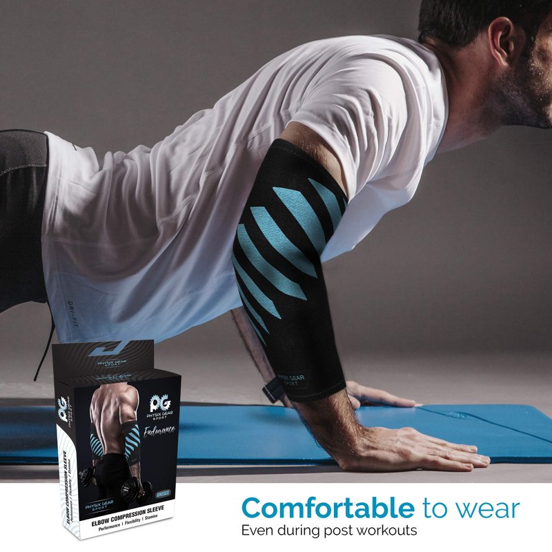 Feel the instant relief of your joint ache discomfort with the Physix Gear Sport compression elbow sleeve men & women love! Simply put on our golfers elbow brace for men/sleeve for tennis elbow for women when exercising or working to experience its pain-busting traits, be it an XL or youth elbow compression sleeve. Buy this tendonitis sleeve elbow now to see why it's the tennis elbow strap women enjoy & the arm compression sleeves men keep buying! The best elbow sleeves for weightlifting w/ lifting elbow support & the elbow sleeve for tendonitis men are looking for! Rediscover mobility w/ Physix compression arm sleeves for men/women. Whether as tennis elbow straps for men, an elbow brace for tennis elbow for women, or as a golf elbow brace men can't live without, we all need an elbow sleeve lightweight enough for work or play. This womens elbow compression sleeve uses a quick drying, breathable material w/ double-stitched seams. 4 sizes available (elbow compression sleeve Small to X-Large) for your sport elbow support, w/ grey & blue color options. The non-slip design of our sports elbow sleeve means these elbow braces stay in place w/o restricting motion. Your elbow brace for women is made from moisture-repelling fabric that keeps sweat at bay. Our elbow sleeve tendonitis pair (or singles) come w/ True Gradient Compression that won't restrict blood flow. This elbow compression sleeve support men women use in weightlifting or in sports provides the forearm pain relief during workouts or for desk jobs w/ repetitive motion. Sold per piece or as a pair, your elbow brace for tendonitis/ tennis compression sleeve/ tennis elbow wraps or golf elbow treatment averts elbow aches & fatigue from weightlifting & other sports. This elbow sleeve for tendonitis women buy online is so stylish, you won't think it's a forearm compression sleeve for tendonitis or a bursitis elbow compression sleeve at all! Enjoy Zero Risk Purchase on your elbow tendonitis brace, no questions asked!