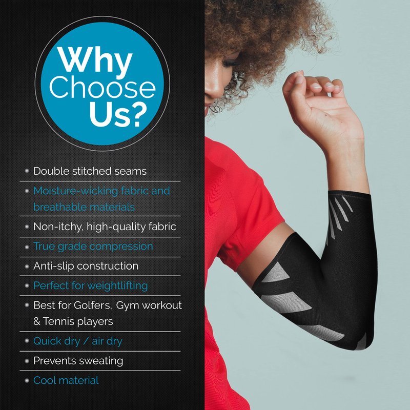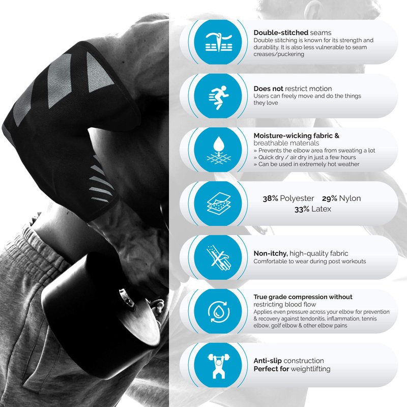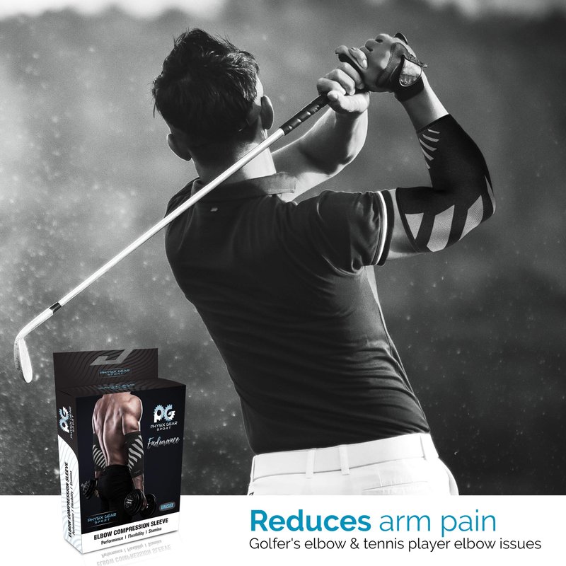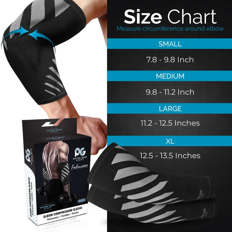 Feel the instant relief of your joint ache discomfort with the Physix Gear Sport compression elbow sleeve men & women love! Simply put on our golfers elbow brace for men/sleeve for tennis elbow for women when exercising or working to experience its pain-busting traits, be it an XL or youth elbow compression sleeve. Buy this tendonitis sleeve elbow now to see why it's the tennis elbow strap women enjoy & the arm compression sleeves men keep buying! The best elbow sleeves for weightlifting w/ lifting elbow support & the elbow sleeve for tendonitis men are looking for! Rediscover mobility w/ Physix compression arm sleeves for men/women. Whether as tennis elbow straps for men, an elbow brace for tennis elbow for women, or as a golf elbow brace men can't live without, we all need an elbow sleeve lightweight enough for work or play. This womens elbow compression sleeve uses a quick drying, breathable material w/ double-stitched seams. 4 sizes available (elbow compression sleeve Small to X-Large) for your sport elbow support, w/ grey & blue color options. The non-slip design of our sports elbow sleeve means these elbow braces stay in place w/o restricting motion. Your elbow brace for women is made from moisture-repelling fabric that keeps sweat at bay. Our elbow sleeve tendonitis pair (or singles) come w/ True Gradient Compression that won't restrict blood flow. This elbow compression sleeve support men women use in weightlifting or in sports provides the forearm pain relief during workouts or for desk jobs w/ repetitive motion. Sold per piece or as a pair, your elbow brace for tendonitis/ tennis compression sleeve/ tennis elbow wraps or golf elbow treatment averts elbow aches & fatigue from weightlifting & other sports. This elbow sleeve for tendonitis women buy online is so stylish, you won't think it's a forearm compression sleeve for tendonitis or a bursitis elbow compression sleeve at all! Enjoy Zero Risk Purchase on your elbow tendonitis brace, no questions asked!