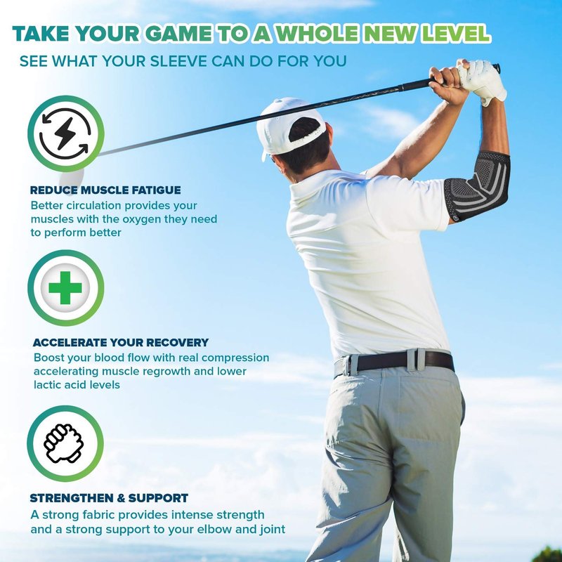 - For Pain Relief & Injury Recovery: Our Compression Elbow Sleeve for Men and Women relieves arm pain, fatigue, and stiffness in your muscles by improving blood circulation and providing protection to your elbow.
