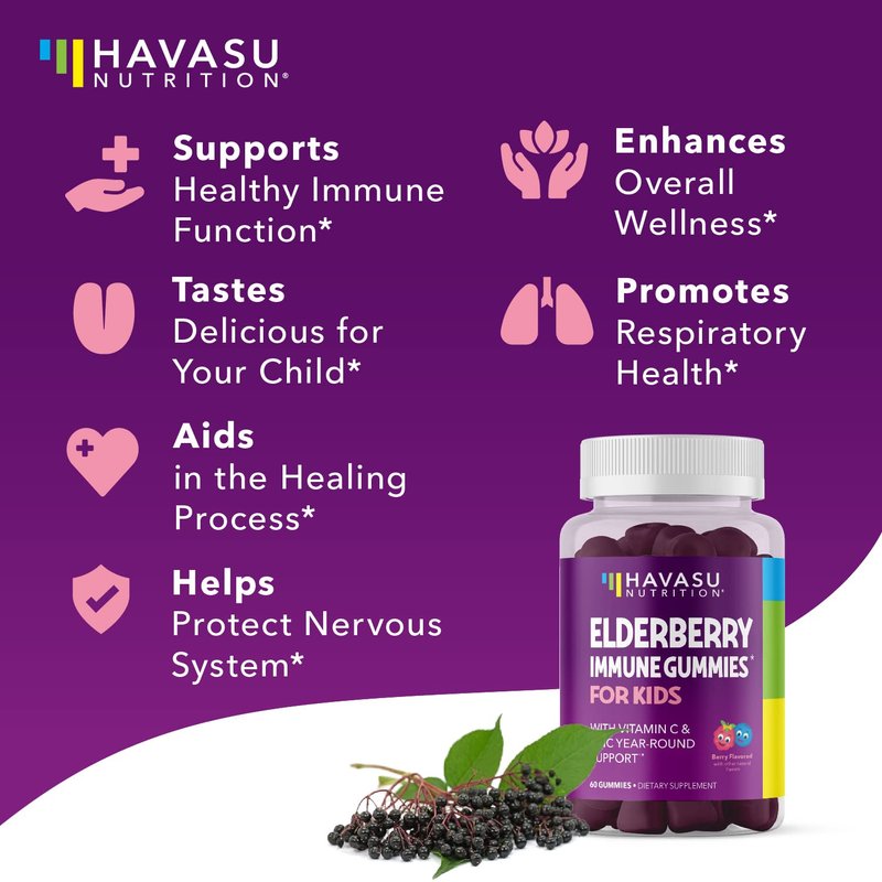 Havasus Elderberry gummies for kids are the immune support your little one needs to deal with the cold season. This black elderberry gummies can be kids elderberry gummies kids are even more potent than the air borne elderberry immune support gummies. As one of the top elderberry gummy in the space, you can feel confident in knowing that you are getting all the sambucol black elderberry gummies for adults that you may need in elderberry zinc. Not only are our gummies tasty for adults, they are elderberry kids gummies too! Check out our kids gummy variation as we thought of the entire family when formulating our product! These kids elderberry gummies with zinc and vitamin c are a powerful choice. These non-GMO, gelatin-free vitamins do not contain high fructose corn syrup and theyre formulated in the USA, in a GMP certified facility, and maintains consistent and controlled quality standards. Elderberry provides a powerful immune boost and is loaded with antioxidants, carotenoids, amino acids, and flavonoids, vitamin A, vitamin B, potassium, calcium, and phosphorus. To ensure ultimate absorption, we fortify our delicious, chewable gummies with zinc and vitamin C. Each gummy contains 50 mg of Black Elderberry which contains immune defense properties that strengthens the immune system and provides a range of health benefits including: relief of the symptoms of upper respiratory illness, digestive health support and constipation relief, which can help relieve allergy symptoms. Organic elderberry gummies also has options within childrens elderberry gummies for elderberry herbal supplements. This elderberry for adults has a zinc elderberry and elserberry, zinc, vitamin c gummies combination. Sometimes people have spellings that are incorrect elberry gummies sambucol elderberry gummies and black elderberry gummies for adult. Sambucus gummies are the elderberry gummies everyone wants for the season!