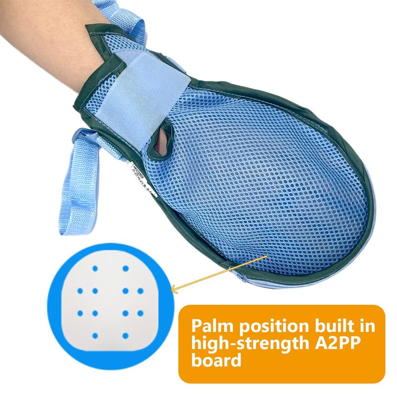 - Palm position with high-strength A2PP board that can prevent self-injury or accidently scratching someone effectively. Breathable mesh structure on the back enables air circulation to keep hand catheter or wounds dry and clean.