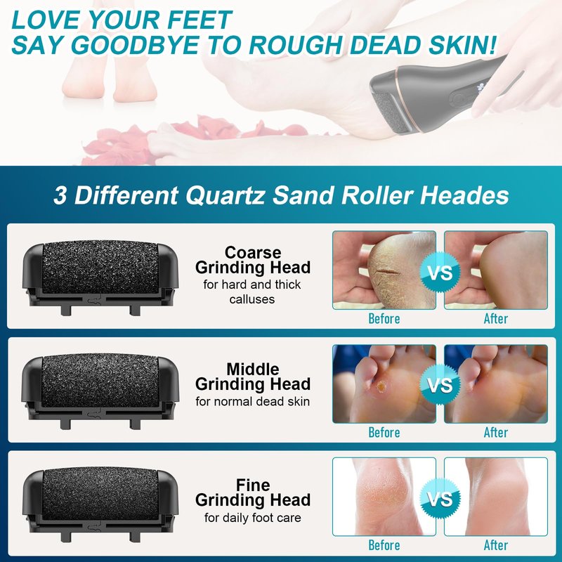 - 🛡️【UPGRADED VERSION -- POWERFUL and SAFE】Upgraded version of electric foot file callus remover is equipped with 3 enlarged quartz crystal removable roller head, quartz roller head wider, larger area to remove dead skin, 2 speeds can correspond to the roughness required to remove the callus on the foot; 1900/2200 revolutions / minute, grinding faster and cleaner; thus effectively removing calluses and cracked heel dead skin, , so that your feet to restore delicate and smooth skin.