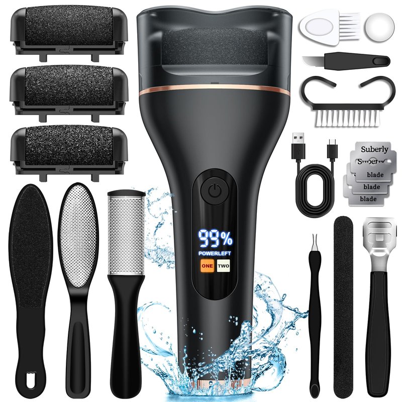 - 【16 IN1 PEDICURE KIT SET】Electric foot callus remover kit is the best foot care tool for you, your family and friends, also a great gift🎁, YOU WILL GET (1x electric callus remover + 1x USB charging cable +3x replacement roller heads +1x cleaning brush +1x V-shaped push stick +1x foot file + 1x callus remover + 1x nail file + 1x double-sided frosted file + 1x callus scraper + 1x small round piece + 3x blades). Give your feet a pedicure with our foot care tool kit!