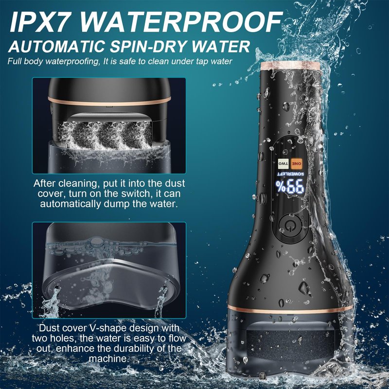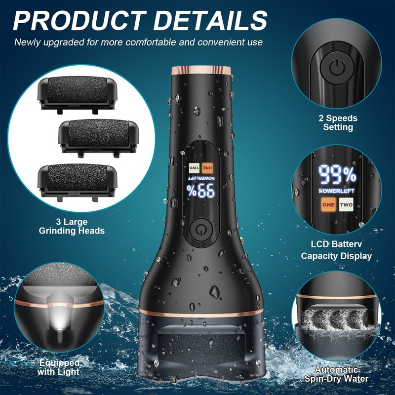 - 【IPX7 WATERPROOF -- AUTOMATIC SPIN-DRY WATER】Our dead skin remover foot grinder has IPX7 advanced waterproof grade, full body waterproof, dry and wet feet can be used, can be rinsed under the tap water; after cleaning, put it into the dust cover and press the starter switch can be automatically spin-dry water, easy to use, safe, the dust protection cover is designed with 2 small holes, so that the water is more easy to flow out, and at the same time increase the lifespan of the callus remover.
