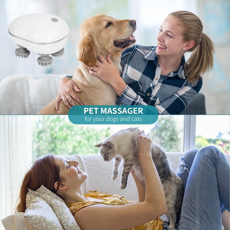 🎯MASSAGE THERAPY DESIGNED EXCLUSIVELY FOR PETS 🐶Rechargeable handheld body and head massager is convenient to take anywhere, which makes your pet enjoy massages anytime. 🐱Electric pet massager replicates the technique of a masseuse to scratch, grasp, pinch and knead your pet's body parts, Use as a pet's massager to help soothe the pet's emotions, avoid hairballs and knotting. Feature: ✅Soft Massaging Nodes Our cat massager for indoor cats features four massage heads with 96 kneading nodes that are made with soft silicone to be gentle on the skin and fur. ✅One-Button Switching Simple and efficient operation, 3 massage modes for your choice. ✅Low Noise With a new generation of innovative motors, there is no more annoying noise during use at home or when traveling, and you won't be bothered by excessive noise. v✅Help Soothe Nerves With a gentle head-to-paw massage to reduce your pet's stress and anxiety. ✅Help Joint Health Use the pet massager over joints to help increase flexibility and circulation while decreasing tension, especially in dogs with osteoarthritis. ✅Promote Bonding with Your Pet Calm your cats and dogs with this soothing massager, deepen the bonding between you and your pets, and make them feel they are a part of the family. Specification: 💥Charging Voltage: 5V-1A 💥Rated Power: 5 W 💥Auto-Off: 10 Minutes 💥Battery Capacity: 1100 mAh 💥Waterproof Level: IPX7 💥Dimensions: 4.3 x 3.5 x 3.1 inch Package Includes 👉1 × Electric Pet Massager 👉1 × User Manual 👉1 × Charging Cable 🔔Note: 1. Fully charge the battery before initial use. 2. Never use the pet massager while it is charging.