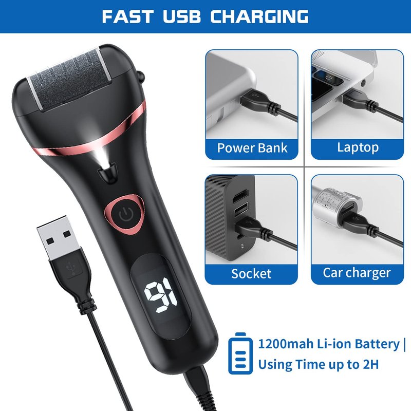 - 【Rechargeable & Equipped with Battery Display and Light】The high-quality electric foot file features a large capacity 1200mAh lithium battery that can operate for approximately 60-90 minutes with just a 2-3 hour charge time. It also includes digital battery display and light that shows the remaining battery life and when to charge. Foot care for women, this dead skin remover's light turns on automatically when the foot file is working, providing illumination on the targeted area of dead skin.