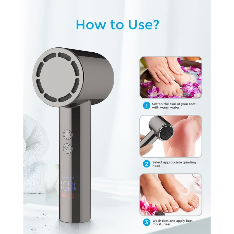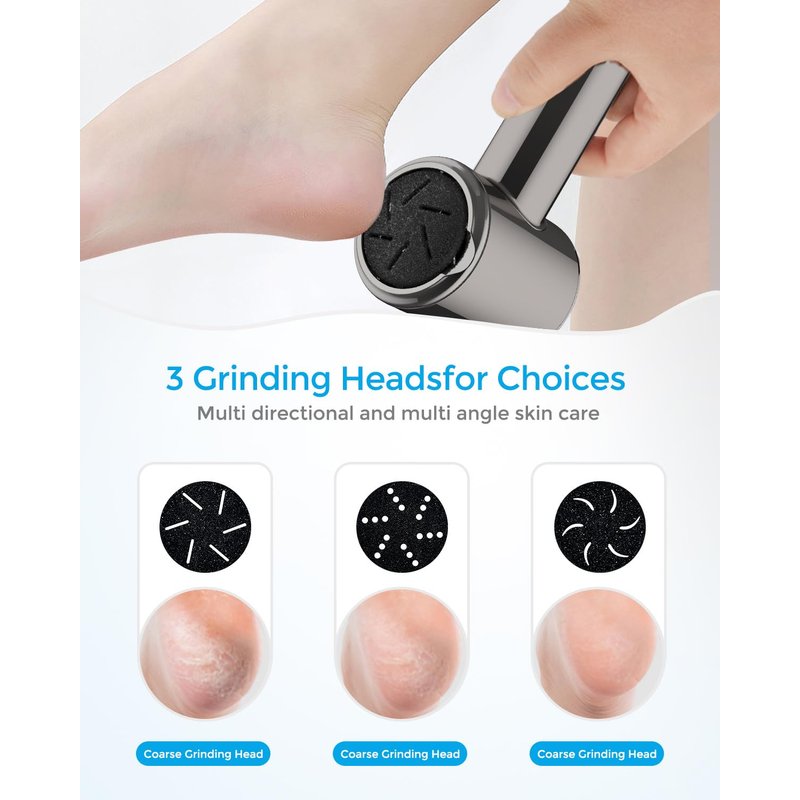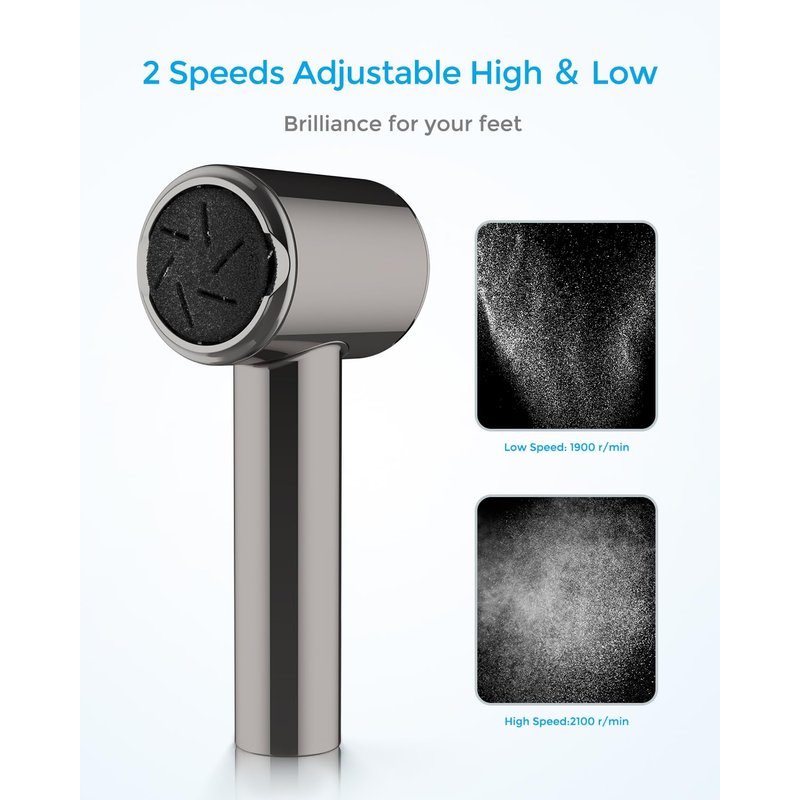 - MULTIFUNCTIONAL: The callus remover comes with three different quartz abrasive heads and two working modes.The scientific speed of 1900/2200 rpm turns dry, hard callused skin into baby-soft, smooth skin in minutes. The professional foot care kit allows you to achieve advanced foot care at home.