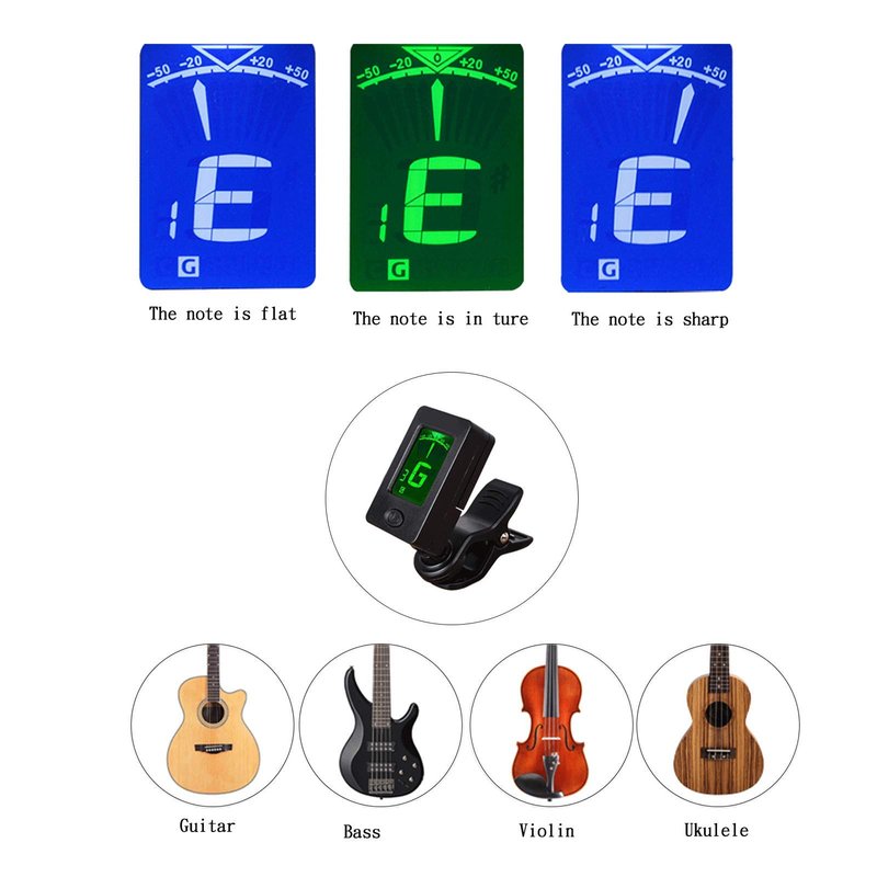 - 【HIGH PRECISE GUITAR TUNER:】 High precise detection and sensitive vibration guitar tuner, clip-on, battery included, no background noise, good for applicable to a variety of environments, designed for Guitar, Chromatic, Bass, Violin, Ukulele, etc.