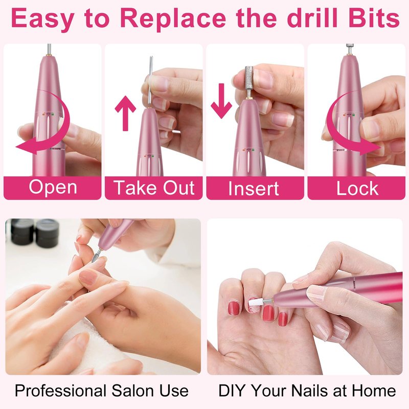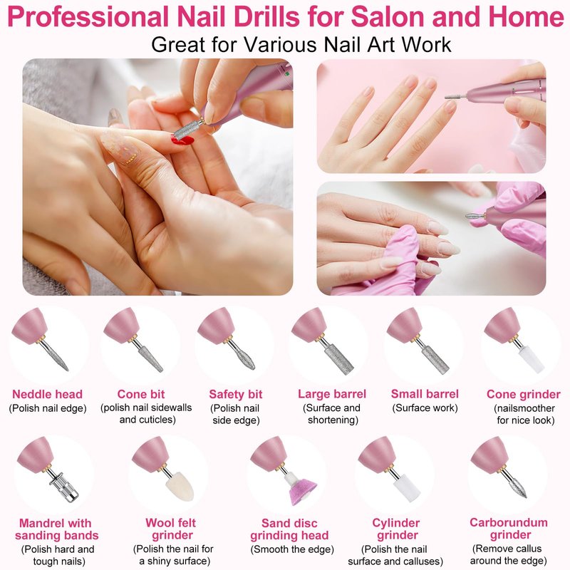 - 【Multifunctional Nail Drill Kit】This nail kit included 11pcs exchangeable nail drill bits and 50pcs sanding bands, perfect for grinding, sharpening, carving, engraving, routing, sanding, cutting, polishing and drilling. This e file nail drill is suitable for natural nails, gel nail polish, acrylic gel, thick nails, cuticle, dead skin. It is a nail drill set that meets all your nail beauty needs.