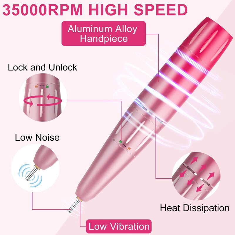 - 【High Speed up to 35000RPM】Our electric nail drill is equipped with a powerful upgrade motor bearing, which enables it working smoothly at a high and adjustable speed (0-35000RPM), just rotating the switch to choose the speed you need, easy to use and safe to control. It is an ideal nail drill machine for both professional technicians in-salon or beginners DIY at home.