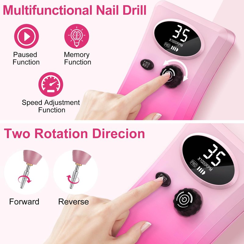 - 【Large Capacity & Smart LCD Display】This professional nail drill built-in a 4000mAh rechargeable large capacity battery, which can provide 12 - 20 hours working time with only 2 - 3 hours charge. With the LCD screen, you can easily know the information such as rotating speed RPM, rotating direction and battery power. And makes it so much easier to use.