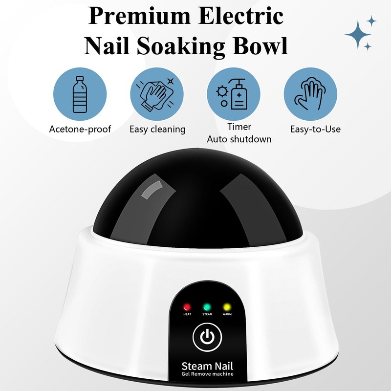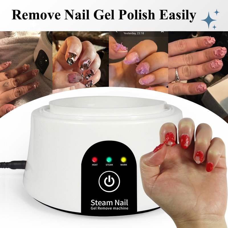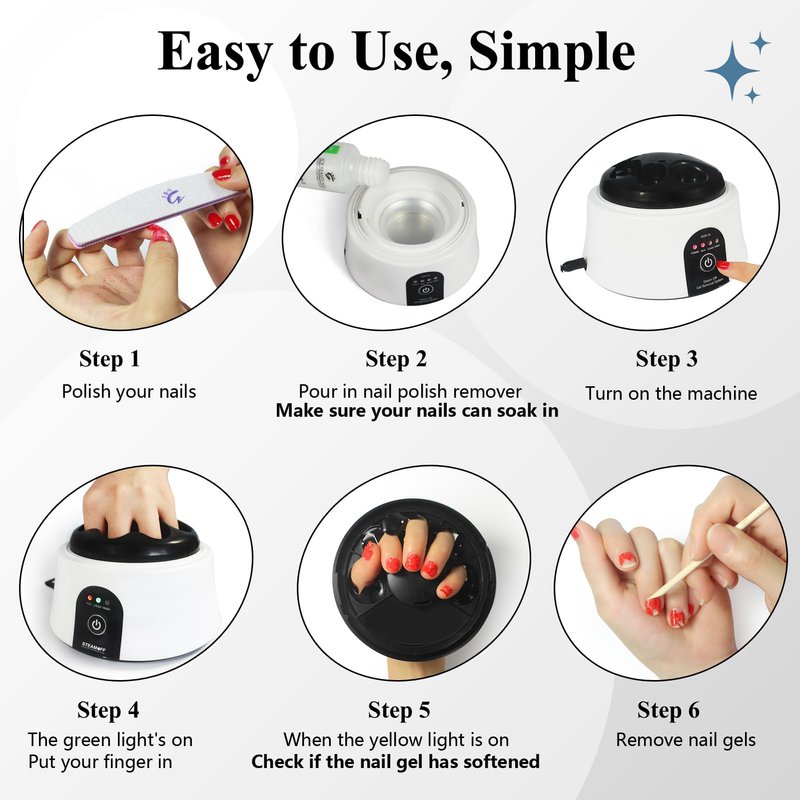 - EASY TO USE: Turn on the nail soaking bowl and pour in nail polish remover. In the meantime, use the nail file to grind the nail gels, put your hand in the machine when "STEAM" the green light is on. When the preset time is up, the machine will automatically shut off. If the nail gel has not softened, turn the machine on again and repeat a cycle.