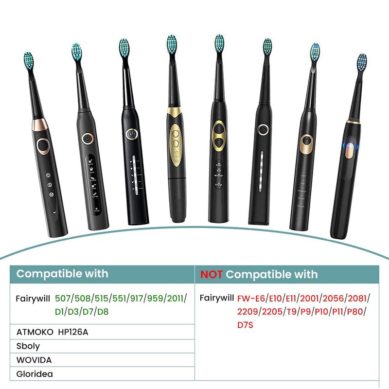 - Our toothbrush replacement heads compatible with Fairywill FW-507/508/551/917/959, FW-D1/FW-D3/FW-D7/FW-D8, YUNCHI Y1 electric toothbrushes. They are NOT compatible with Fairywill FW-E11/FW-P11/FW-P80, and NOT for kids toothbrush.