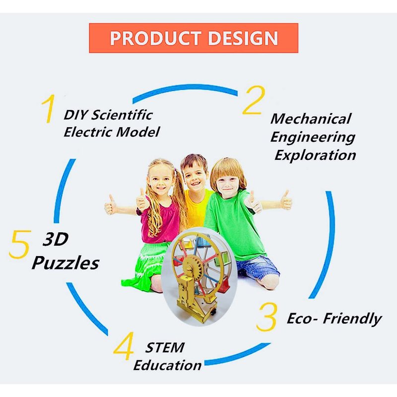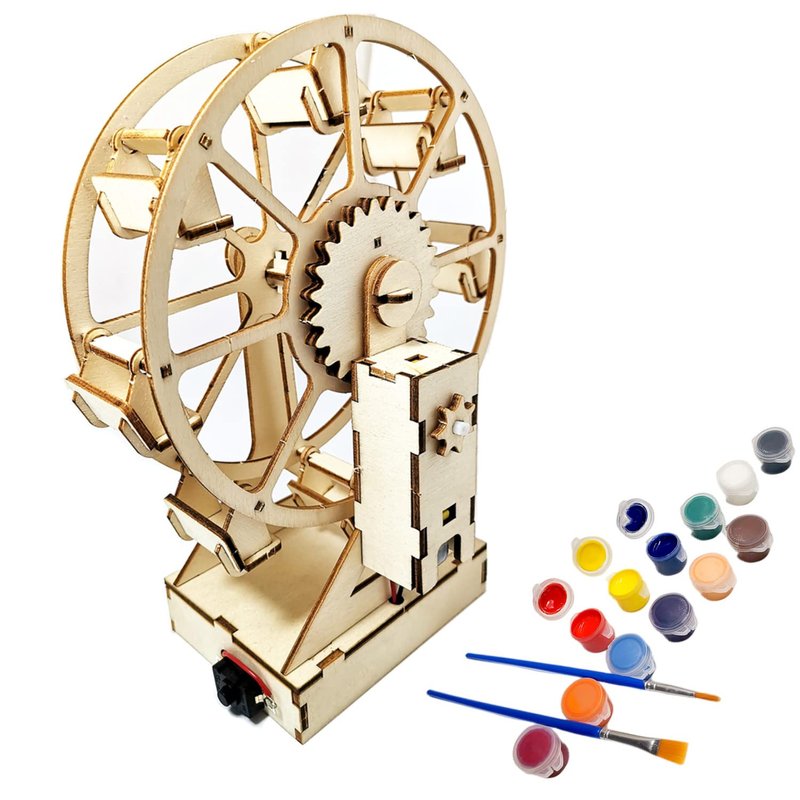 We designed this Ferris wheel model building kit to inspire young inventors to build and paint it. Stimulate their curiosity and creativity, develop hands-on ability and engineering logical thinking ability. - Easy to assemble building kit, - comes with everything you need to building a Electric Wooden Ferris Wheel Model and Detailed steps assembly instructions; - Intro to Engineering; - Learn real world application by building 3d puzzles with motor and snap circuits. This include all the tools and materials necessary to complete this mechanical structure; - Eco- Friendly 3D Puzzle for Adults and Kids - This kits are safe and stimulating fun. Perform rewarding science experiments with your family or friends. Perfect scientific gift for kids or Teens and Adults; - The wooden pieces of the Ferris wheel can be painted. This will add another layer of fun and creativity to the entire endeavor.Note! - All these models need to be assembled by yourself. 2 AA batteries required(Not included in PACKAGE! )