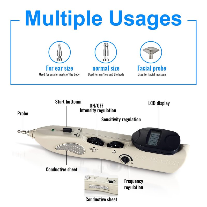 - MULTIPLE USE & AFTER-SALE SERVICE: The Electronic Acupuncture Pen comes with 3 replaceable massage heads. For face by using the biggest round shape head.For ears by using the small head.We aim to provide the best service possible to our customers. If there is any problem with the product, please do NOT hesitate to contact us and we will offer 100% satisfaction after the sale.