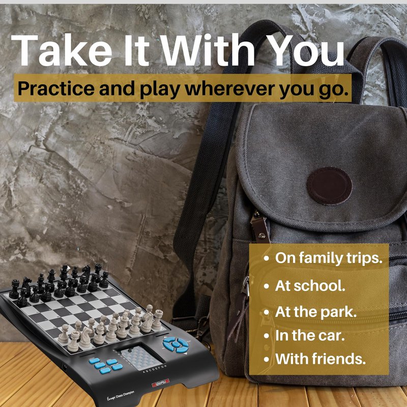 Play against the chess computer at your level on this convenient electronic game for solo chess play The Chess Champion chess computer is ideal for both beginning and expert chess players Improve your chess with the chess computer. Take it with you convenient portable size makes the chess computer easy to take along on travels. To make moves press lightly on the squares with Millennium’s unique HighSensitive technology while a lighted LCD screen shows chess moves current position and menus Play levels suitable for all levels from first-time players to expert tournament players Take back moves or see suggestions for better moves Keep your mind active with endless chess enjoyment by adding optional AC power adapter for at-home play. For Beginners, Chess Coach will warn of bad moves, offer a redo, and make suggestions for optimal moves Displays all legal moves. An unlimited number of moves back and replay. Features Easy system setup LCD display with backlight option. Multilingual user interface. Game Variations: Millennium boards often offer a range of game variations, allowing players to explore different chess variants and rule sets. Energy saving mode when using batteries Specifications Magnetic pressure sensor board 7 Languages. Requires 3 AA Batteries. Optional Power Adapter Sold Separately.