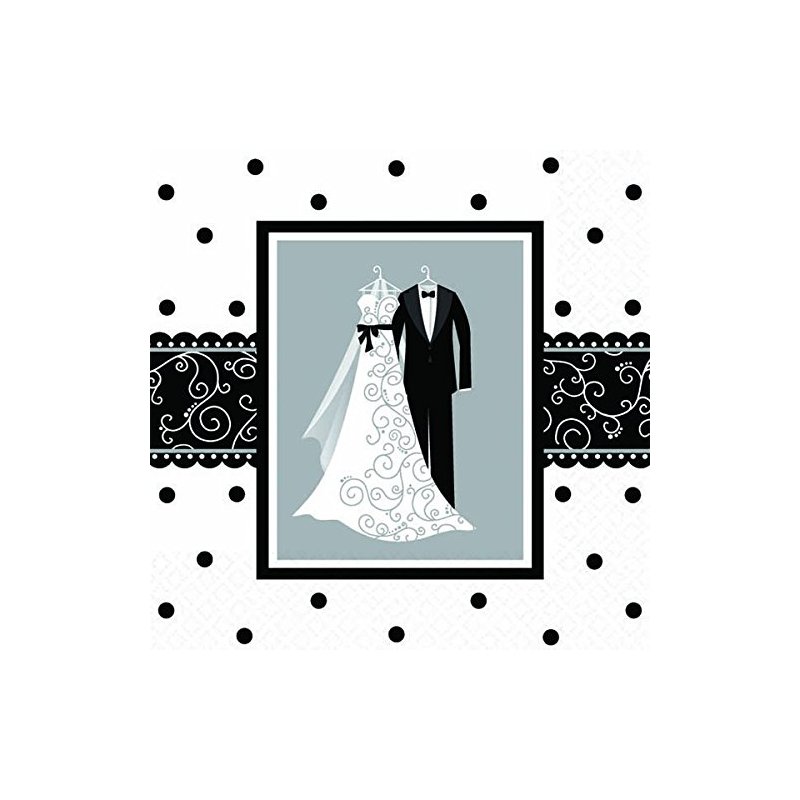 Use these Black and White Wedding Beverage Napkins at your big day! Package includes 16 paper napkins featuring a wedding gown and tux on a polka dot background and black scroll work border through the middle. Each measures 5" by 5".
