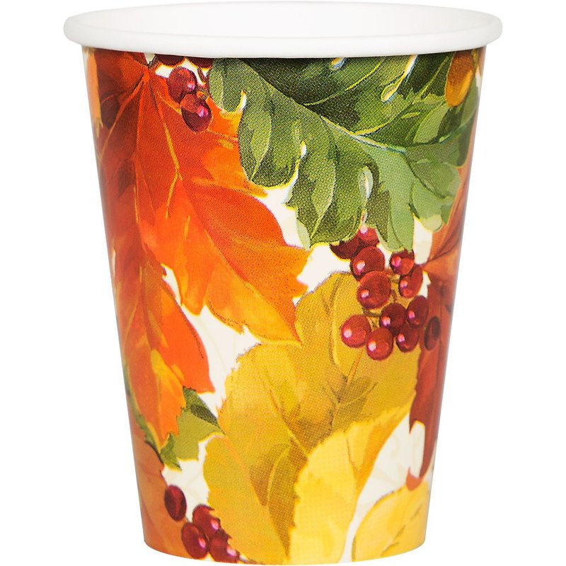 Serve warm cider in our Elegant Leaves Paper Cups! Each cup features a colorful fall leaf pattern. Perfect for hot or cold drinks! Holds 9 oz. Includes 8 paper cups per package.
