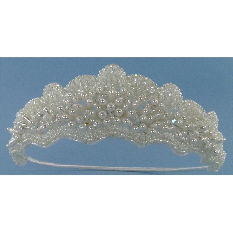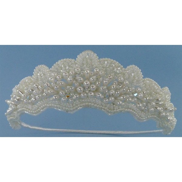 This elegant pearly bridal crown adorned with bugle beads and accented with iridescent crystal bead is your perfect headpiece for wedding, prom, quinceañera, and other special occasions The ornamented section measures about 11 inches by 1 3/4 inches at tallest point and frame ring size is 19 inches. It coordinates best with dresses in like color shades.