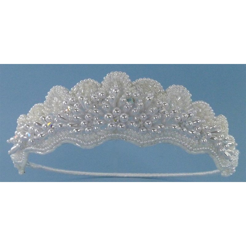 This elegant pearly bridal crown adorned with bugle beads and accented with iridescent crystal bead is your perfect headpiece for wedding, prom, quinceañera, and other special occasions The ornamented section measures about 11 inches by 1 3/4 inches at tallest point and frame ring size is 19 inches. It coordinates best with dresses in like color shades.