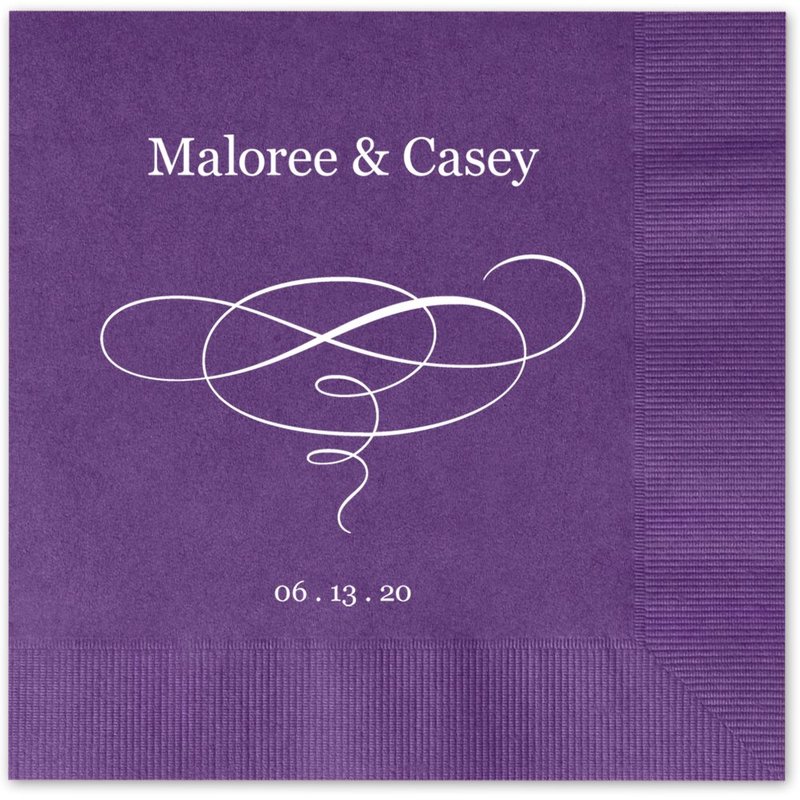 Purple personalized beverage napkins are custom printed in your choice of one foil color. These square 4 3/4 inches by 4 3/4 inches folded 3-ply napkins can be personalized for a wedding reception, bridal shower, bachelorette, engagement party, anniversary, or other special occasion. Be sure to order plenty of napkins for your event! We recommend an estimate of 2 to 3 napkins per person.