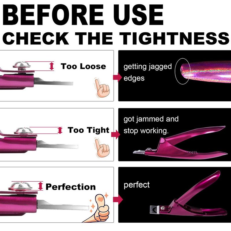 Made of Premium Quality Stainless Steel & High Quality Painting Material -- Good quality material guarantees you will receive an Excellent product Electrophoresis Processing Technique-- Unlike other painting technique, this gives better protection to the clip and looks much more beautiful Powerful & Sharp Clip-- Gives you full support to clip your nail very easily. Ergonomic Size--The length is approx 5.1 inches, suitable for different palm size of most of the people Suitable for acrylic false nails, artificial nails and natural nails-- Almost all kinds of nail clipping could be used for.Package include:1x Stainless Steel False Nail Tip Clipper Cutter 1x Replacing Cutting Blade 1x Screwdriver TIPS:1.If you feel the clipper is stuck once you squeeze to clip, please check the tightness of the screw.