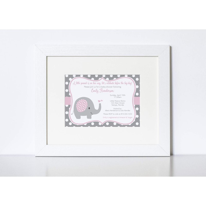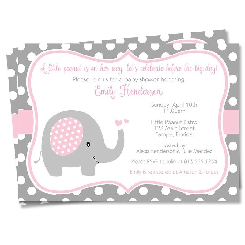 - ♥ Invite guests to your girl baby shower with this pink and gray invitation featuring a sweet baby elephant, bordered in polka dots, and accented with hearts.