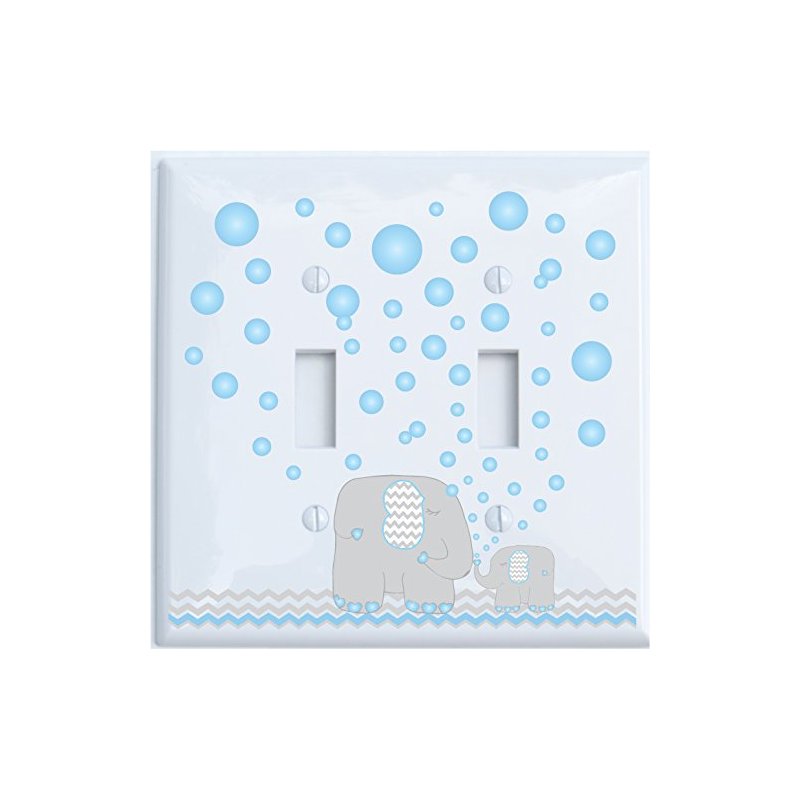 - Gray and Blue Elephants Switch Plate Covers. One Baby Elephant blowing Blue Bubbles set on a back ground of white with Blue and grey chevron at the bottom of the Switch Plate