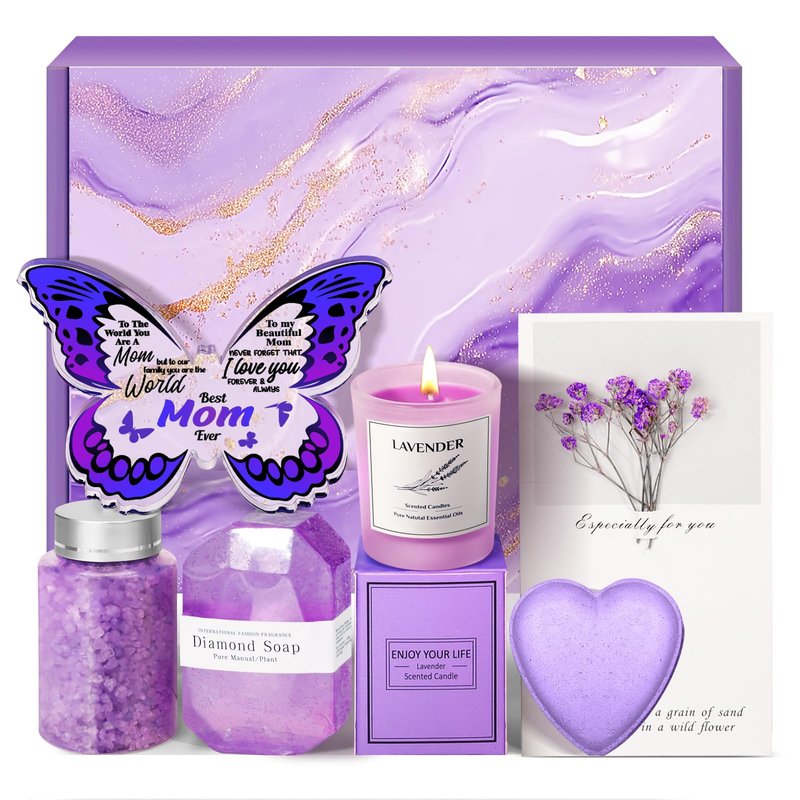 - Practical 6-in-1 Mom Gifts: Each gift basket contains 1*4.5x3.3 in butterfly-shaped acrylic keepsake, 1*lavender-scented candle, 1*diamond soap, 1*heart-shaped bath bomb, 1*bath salt, and 1*greeting card. Surprise mom with this unique mom gift set. Sincerely say "Love you forever"