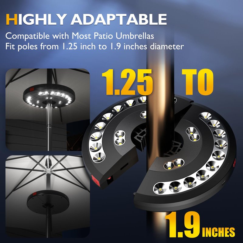 - Easy to Install: Designed to be compatible with most patio umbrellas on the market, this easy to install umbrella light for outdoor patio has a built-in clamp that automatically adjusts to the diameter of the pole and never requires tools for installation. Fit pole size from 1.25 to 1.9 inch in diameter. (PS: It cannot be turned on while charging. After charging, please remove the cable and then turn it on.)
