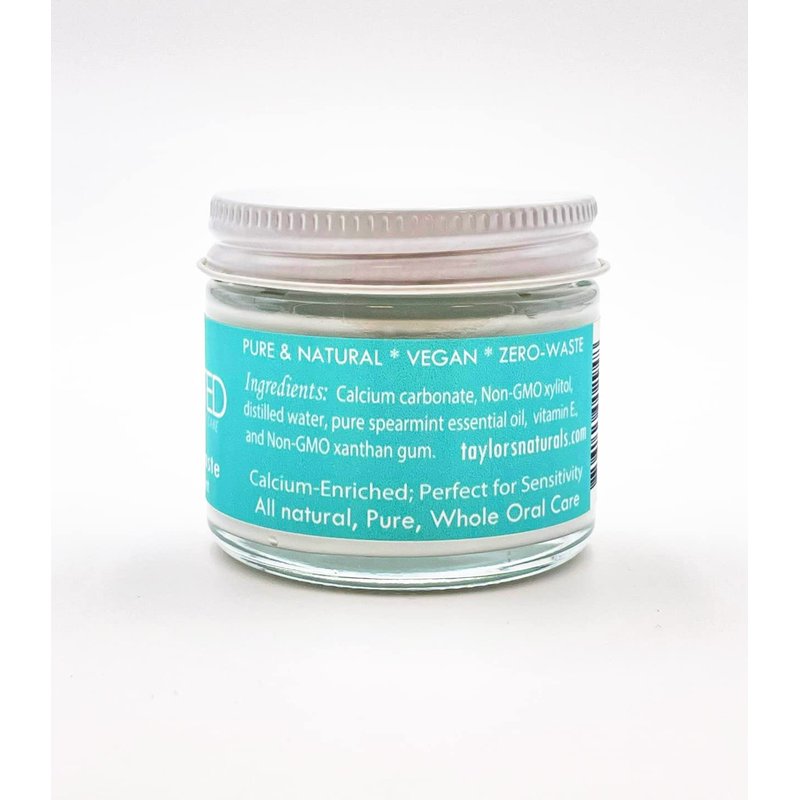 Elevated Toothpaste by Taylor’s Naturals. Stored in glass jar. Sweetened with xylitol, our toothpaste is fluoride free and tastes great. Vegan, non-GMO, Cruelty-Free. 100% Pure & Natural. Directions: Dip toothbrush into jar, adding just a pea size amount onto your toothbrush, and brush thoroughly. Keep it fresh - Replace cap when done. Ingredients: calcium carbonate, non-GMO xylitol, distilled water, xanthan gum, pure essential oil (depends on flavor), vitamin E. Made in small batches by Taylor’s Naturals (BALM! Baby and Elevated Body Care brands) in the USA.