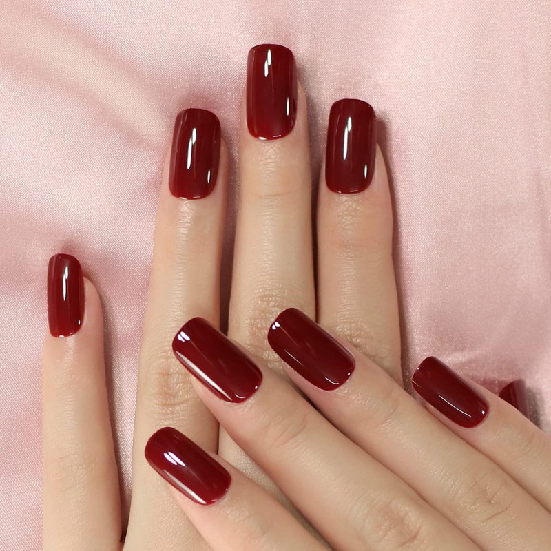 Elevenail Press on Nails Glossy Dark Wine Red False Nails Medium Length Square Fake Fingersnails Daily Manicure Salon DIY Faux Ongles Solid Red Nails Art Tips Gifts for Women Girls
