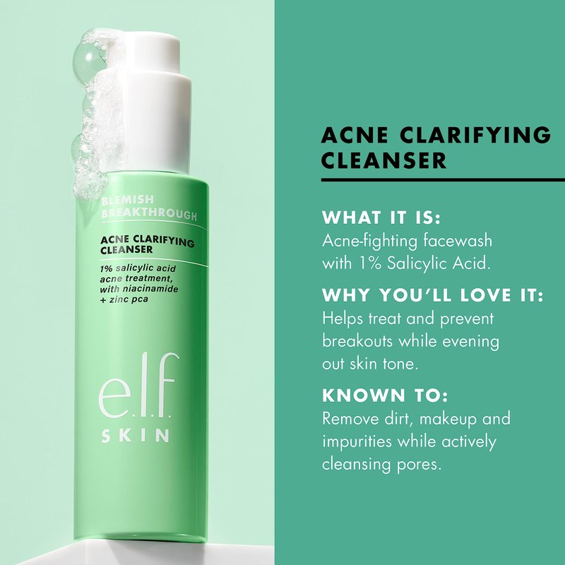 - PROMOTES HEALTHY SKIN: The e.l.f. SKIN Blemish Breakthrough Acne Clarifying Cleanser helps reduce current acne and promote healthy skin post-breakout.