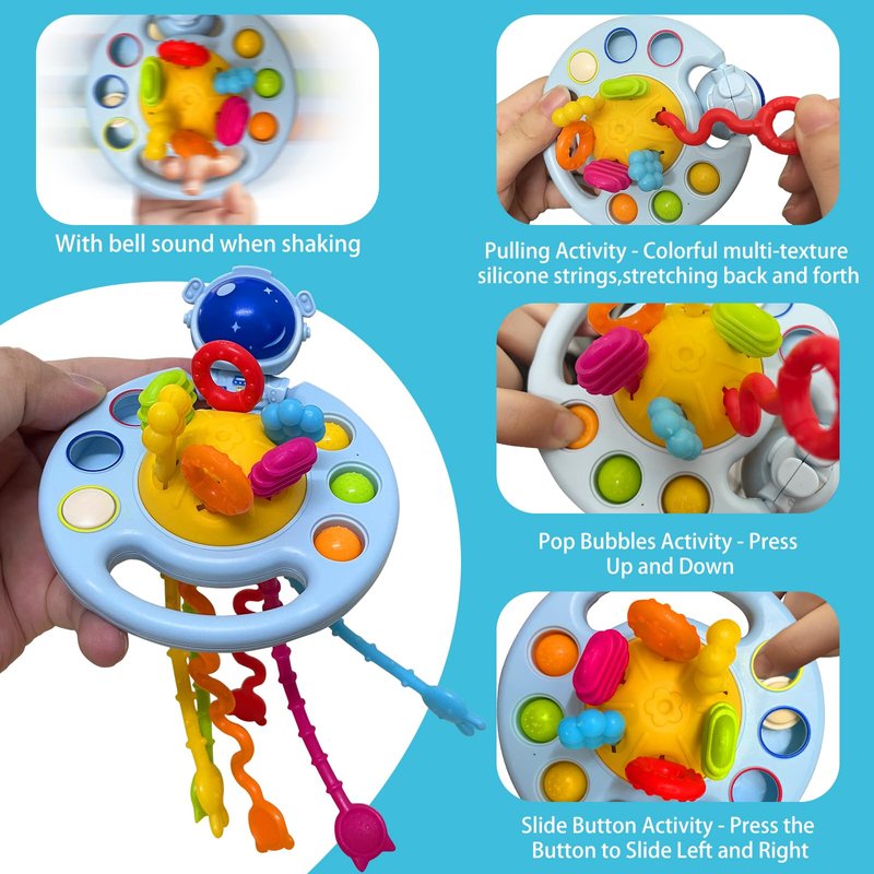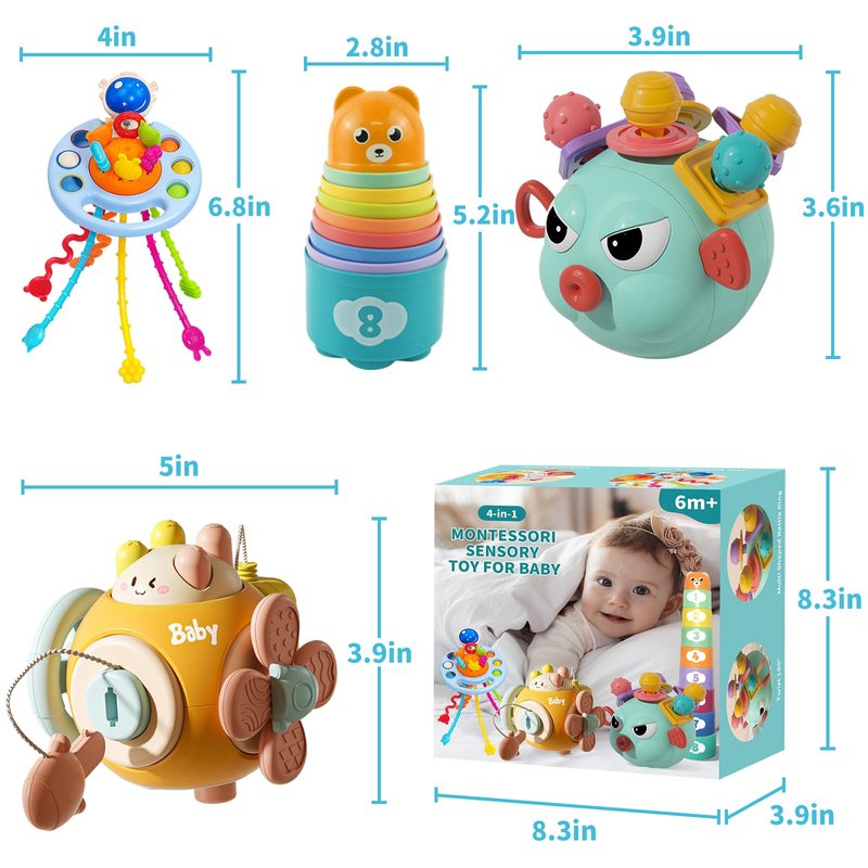 - Package Included: The 4 in 1 Montessori toys set contains busy activity cube, silicone pull string, stacking cups and teething toy. Great sensory toys for 6-12 months old babies.