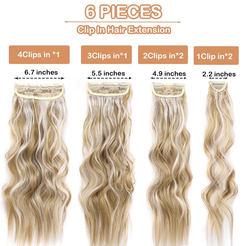 【Product Specifications】 Get instant volume with our 20-inch, 240g clip-in curly hair extensions set, which includes 6 pieces with various widths and clips for easy application. The package consists of 1 piece of 6 inches wide weft with 4 clips, 1 piece of 5.5 inches wide weft with 3 clips, 2 pieces of 4.9 inches wide weft with 2 clips, and 2 pieces of 2.2 inches wide weft with 1 clip. 【Material & Benefits】 Our curly clip-in hair extensions are made of premium quality heat-resisting synthetic fiber, which gives them a natural look and feel just like human hair. With a soft and smooth texture, these extensions are easy to comb, tangle-free, and suitable for women and girls with thin hair, instantly boosting volume and length. 【Easy to Apply and Customize】 Say goodbye to messy and complicated hair extension installations with our clip-in hair extensions. Unlike traditional extensions, ours don't require tapes or glues that can damage your scalp and hair. Our set also includes two extra 1-clip pieces for more flexibility in styling and distributing clips to match your hair volume and length. You can easily trim and reshape your hairstyle according to your own hair length. 【Maintenance & Care】 Our hair extensions are sewn by hand, so it's essential to handle them with care. Gently comb the extensions with a wide-toothed comb to keep them looking new and fresh. Our synthetic hair fibers may get tangled after use, but you can easily prevent this by using a conditioner-water mixture to spray on the extensions. This will keep your extensions from getting dry and tangled, making them easier to manage and style. 【Customer Service Guarantee】 We value our customers' satisfaction and are committed to providing the best quality products and customer service. If for any reason you are not satisfied with your purchase, please don't hesitate to contact us, and we will respond within 24 hours with the best possible solution. Additionally, we offer a no-reason refund or return service