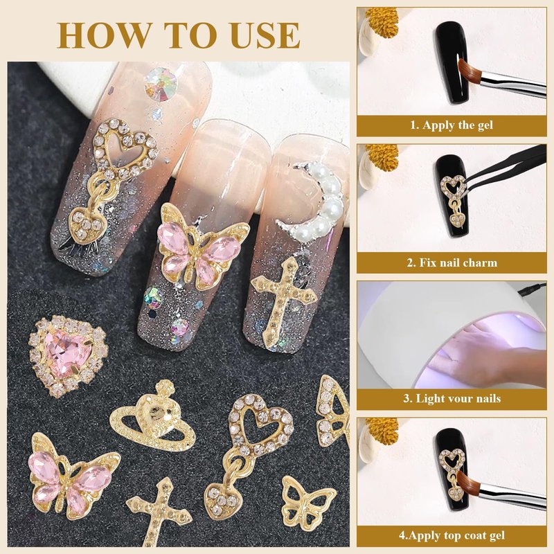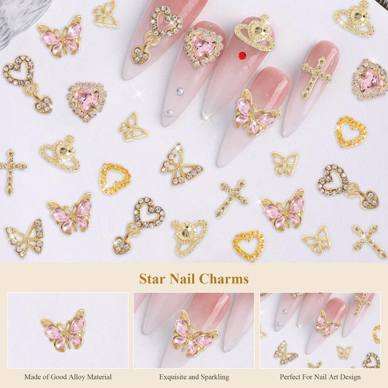 - Exquisite Design:These butterfly and heart nail charms aare made of premium quality stainless alloy and clear&pink crystal rhinestones,making these nail decoration shiny and bling. These 3d butterflies nail art crystals gems will give you a personalized look without going to a nail salon and get fun of DIY nail art.
