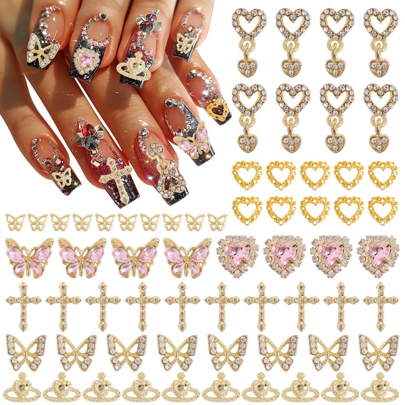 Eliongpu 64Pcs Butterfly Nail Charms for Acrylic Nails Gold 3D Cross Nail Charms Heart Nail Gems for Nails Dangle Heart Charms Luxury Nail Decoration Accessories for Manicure Design (Gold)