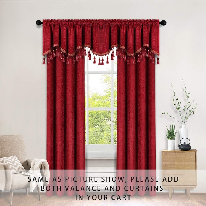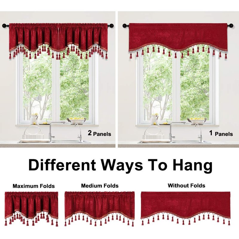 The luxury curtain valances include 1 panel,size 52" wide by 18" long. Different folds can fit different rod width, rang from 25"~52". Rod Pocket with 1" header can make the valance more elegant. The luxury curtian valance can be hung alone and let the light in, and also can be hung with same paattern curtain which can bring more beautiful and romantic feeling(Double rods may be needed).