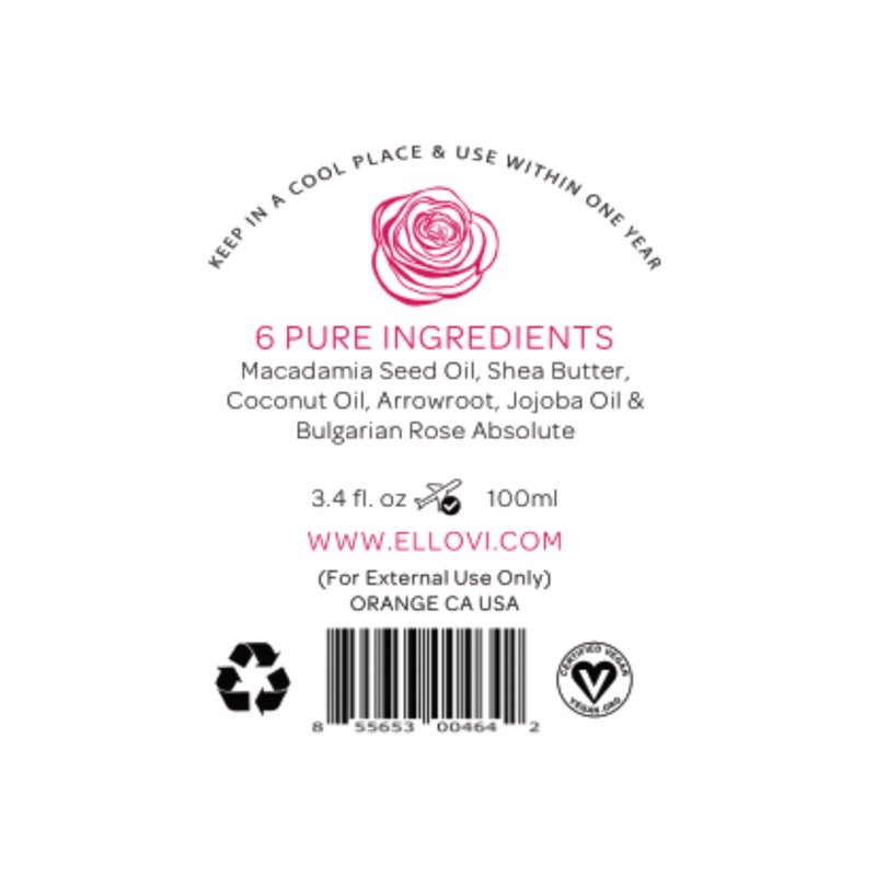 - ONLY 6 NATURAL INGREDIENTS: Macadamia Butter (Omega 7), Shea Butter, Coconut Oil, Arrowroot Powder, Jojoba Oil (Vitamin E and B-complex), Bulgarian Rose Absolute.