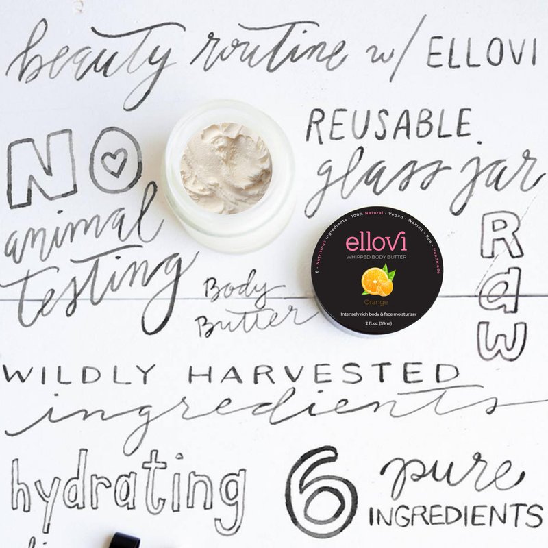 Whipped butters elevate their absorption creating a sense of luxury and weightlessness, melting quickly when touching skin for maximum hydration. Experience the clean and lightly invigorating scent of this non-greasy, fluffy butter, perfect for daily use. Ellovi Butter is a 6-ingredient moisturizer that is so pure you could eat it. What's really special about Butter is that we don't add water. That means it's highly concentrated, can't evaporate like other moisturizers, and we don't need preservatives. Butter soaks in deep and moisturizes your skin better from the inside out. Even after washing your hands or bathing, Butter will keep your skin intensely hydrated and nourished for days. Ellovi created Butter because other body butters and moisturizers are full of unnecessary chemicals, parabens, and preservatives created in science labs. Your skin is like one giant sponge, so you've got to protect it from soaking in the bad stuff. Ingredients: Macadamia Butter (Omega 7), Shea Butter, Coconut Oil, Arrowroot Powder, Jojoba Oil, Orange Essential Oil