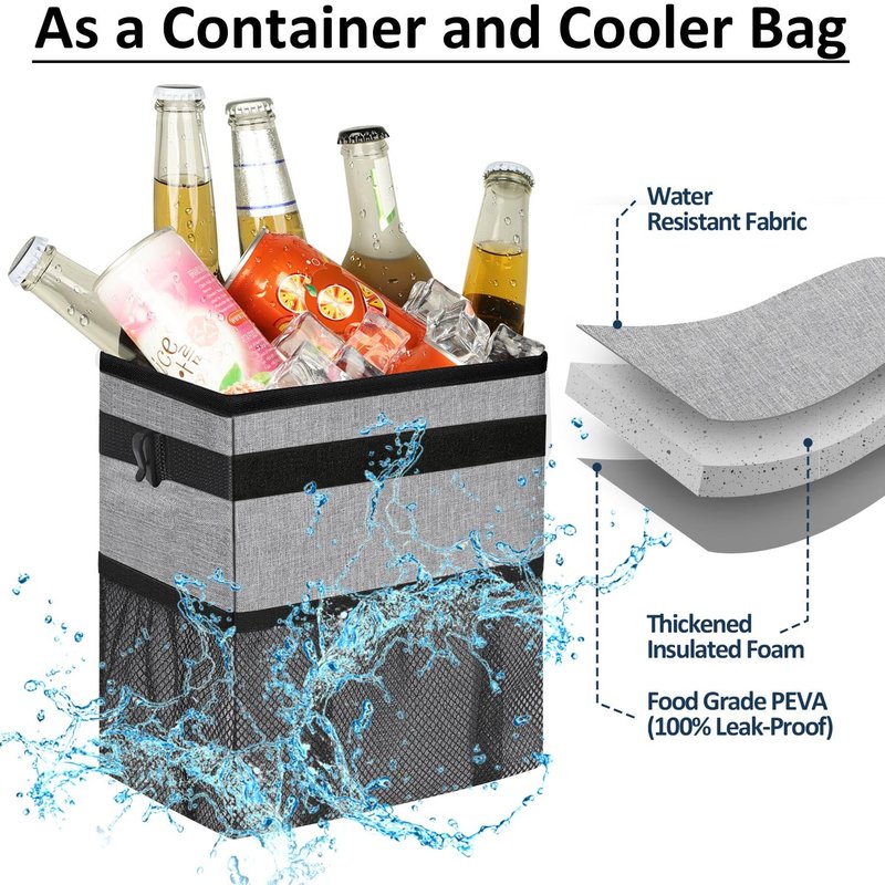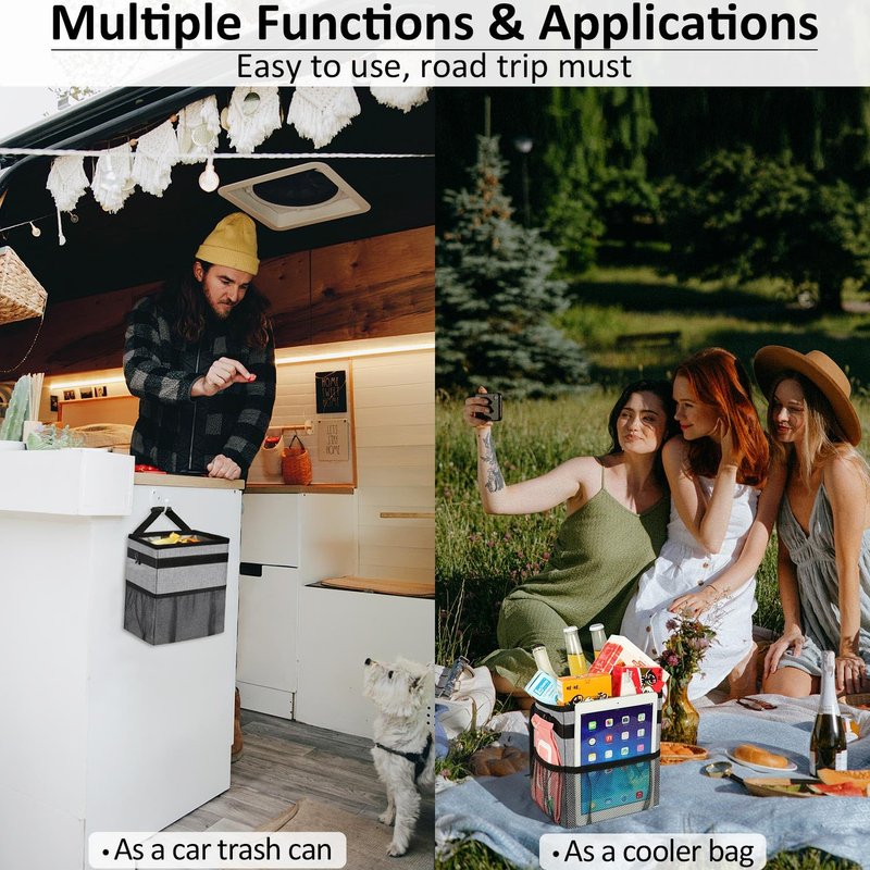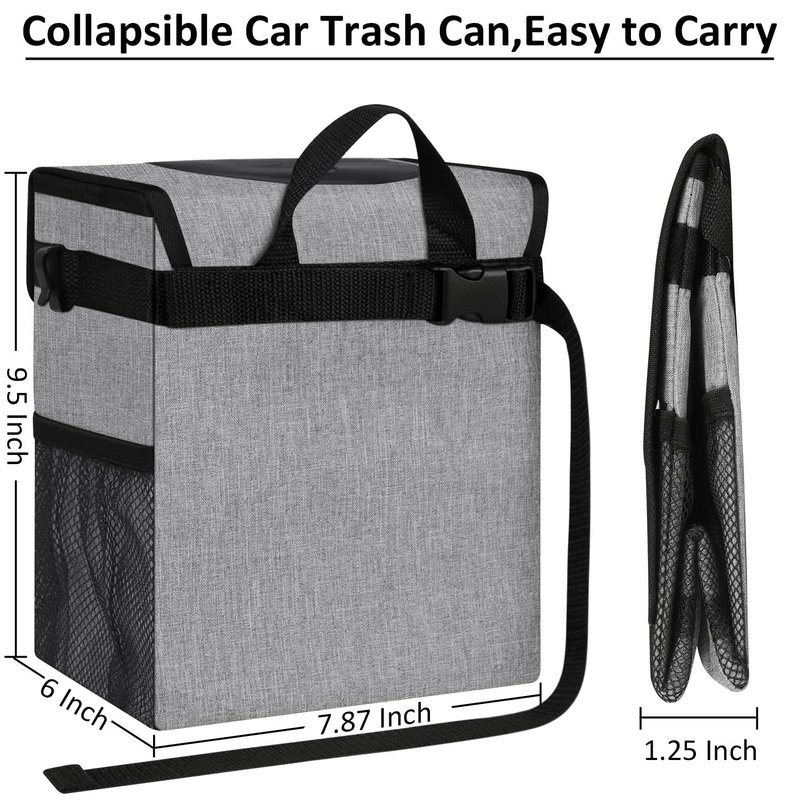 - 【MULTIFUNCTIONAL USAGES】ELONGRIVER trash bin for car can also be a small temporary cooler bag, lunch bag and car storage organizer since its insulated function. The vehicle trash can is about 2 gallons, with 3 elastic storage pockets, you can store some trash for car, water cups, tissues, snacks, toys, wipes and beverages. As a collapsible trash bag for car, when you don't need it , you can fold this small car trash can to save room.