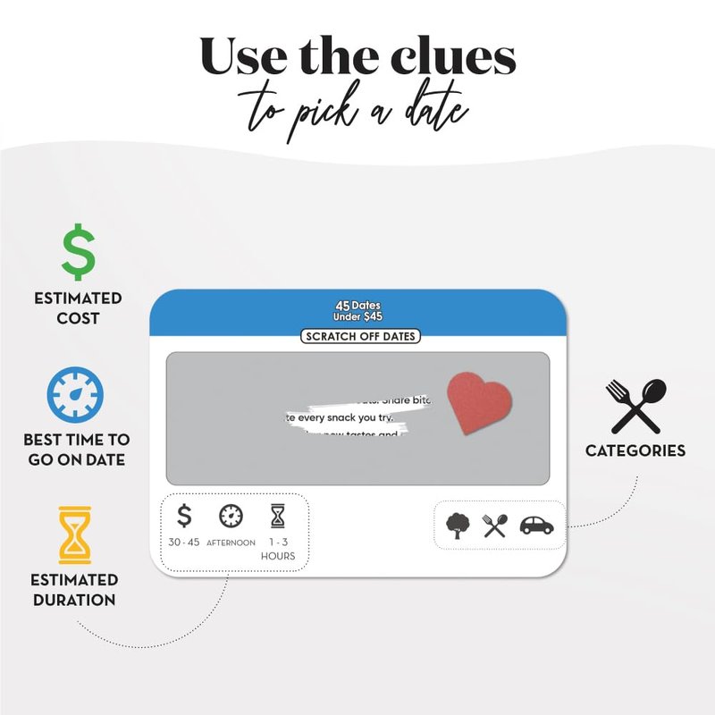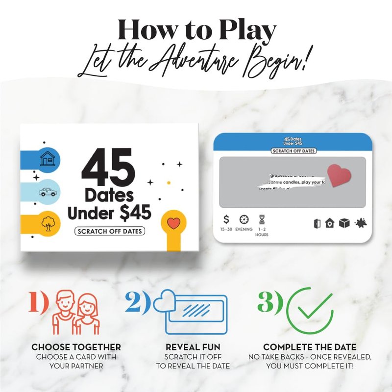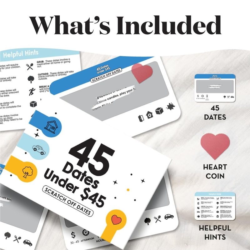 - What's Included: A set of 45 unique scratch-off date night cards and two heart shaped coins for easy scratching; Great for wedding anniversary gifts for couple, bf or gf gifts and cool anniversary gifts for men