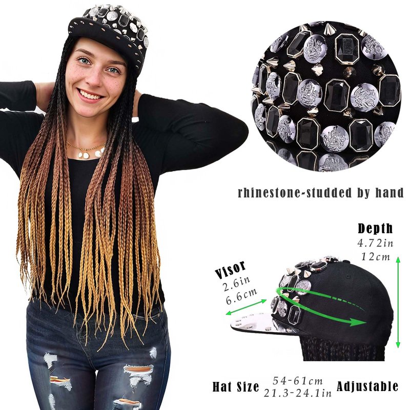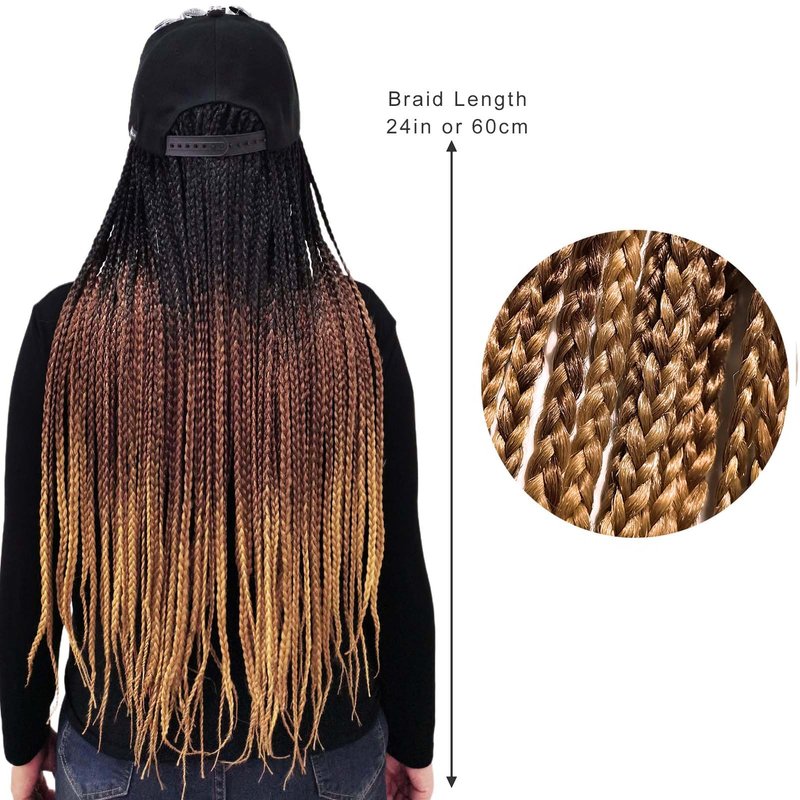 ELVAELFI 24inch Box Braid Hair Extensions Ombre Brown, Punk Studs Flat Baseball Cap Wigs for Women Girls Easy Wear