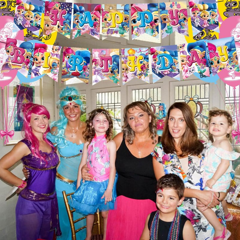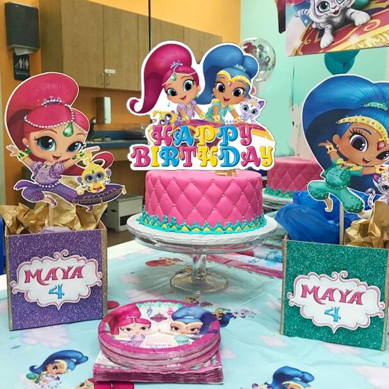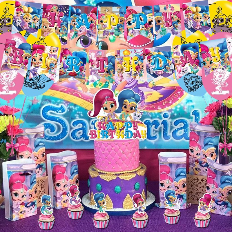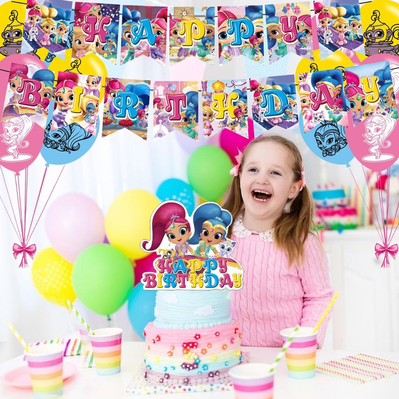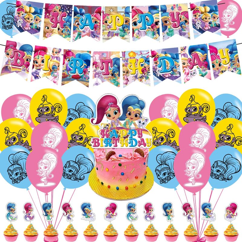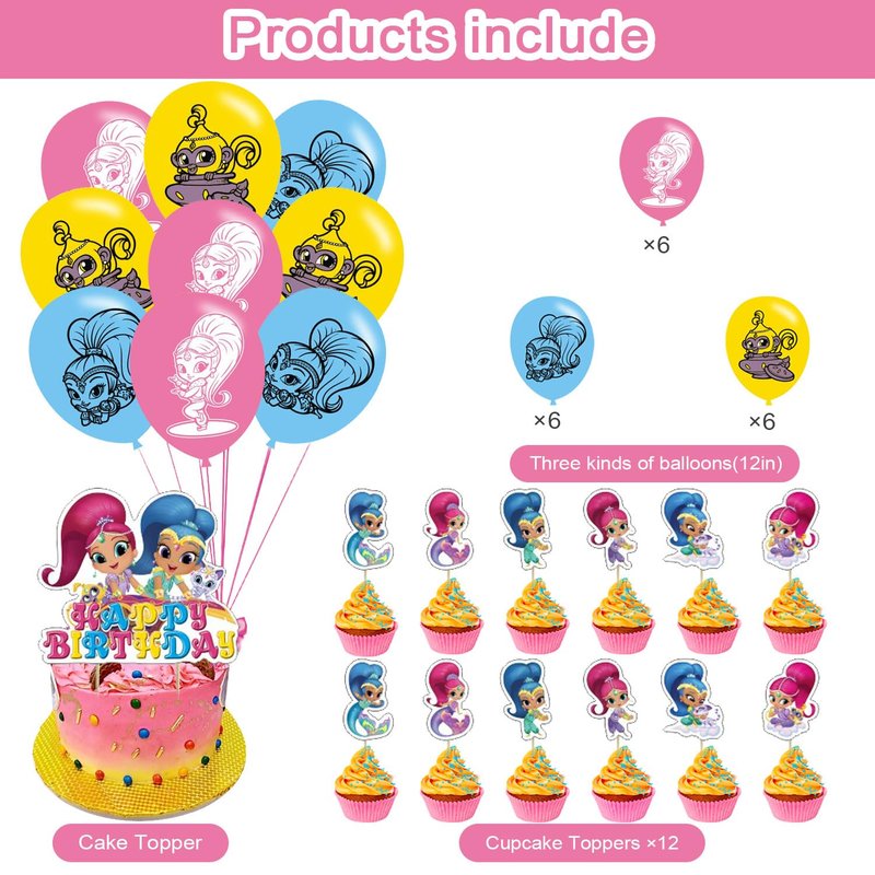 - Package Includes:Package includes Shimmer and Shine happy birthday banner,18 pcs bright balloon set with 3 styles,1x unique cake topper,12 x cupcake toppers.It is a wonderful cool gift for your kid or friend who loves the theme of the Shimmer and Shine series, and all-in-one pack is easy to carry,enjoy your birthday party.