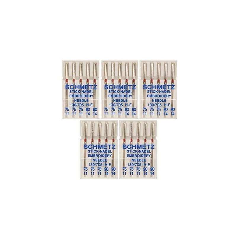 The SCHMETZ Embroidery needle has a light ball point, enlarged eye and wide groove. The Embroidery needle protects fast moving, fragile threads against excess friction allowing trouble-free embroidery and decorative stitching. Assorted Sizes- 11/75 (3) & 14/90 (2) per Card
