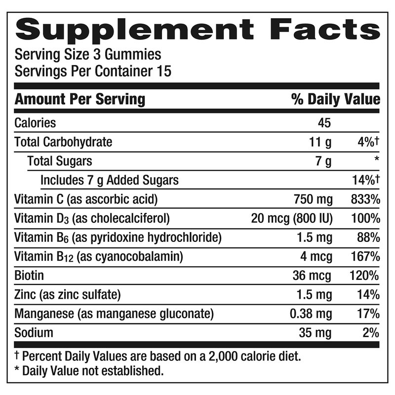 Dietary Supplement. Natural flavor with other natural flavors. Gluten-free. Vegetarian. High potency vitamin C. Antioxidants (vitamin C, zinc, and manganese) to support immune function. Natural fruit flavors. Vitamin D plays an important role in regulating immune system function. Caffeine-free. Due to use of plant-based colors, gummy appearance may darken over time. This does not alter the product potency. emergenc.com. Consumer Line: 1.888.425.2362. emergenc.com. (This statement has not been evaluated by the Food and Drug Administration. This product is not intended to diagnose, treat, cure or prevent any disease.)