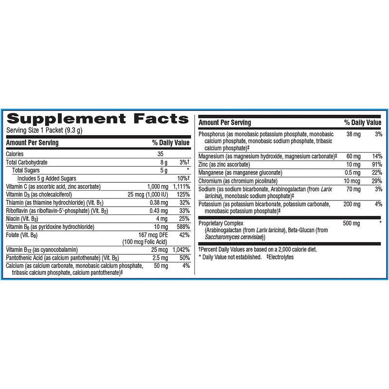 - 50ct of Emergen-C Immune+ Triple Action Immune Support Powder, with 200mg of BetaVia (R), 1000mg Vitamin C per serving, B Vitamins, Vitamin D, Zinc and Manganese (2)
