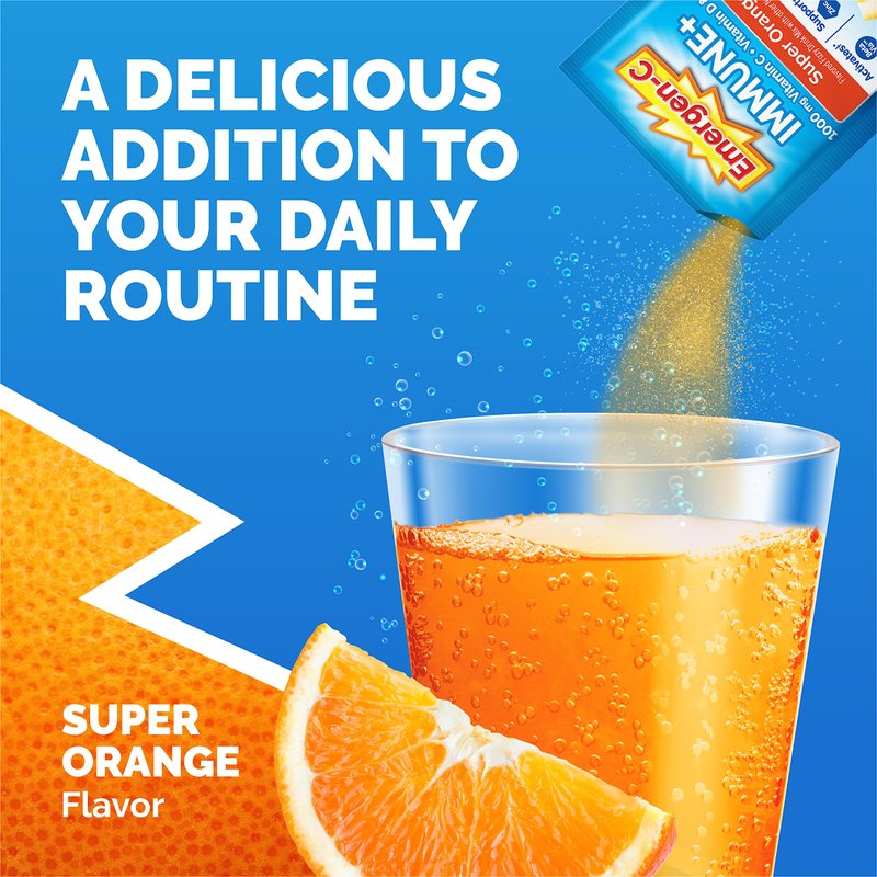 Emergen-C Immune+ Triple Action Immune Support Powder, BetaVia (R), 1000mg Vitamin C, B Vitamins, Vitamin D and Antioxidants, Super Orange – 50 Count